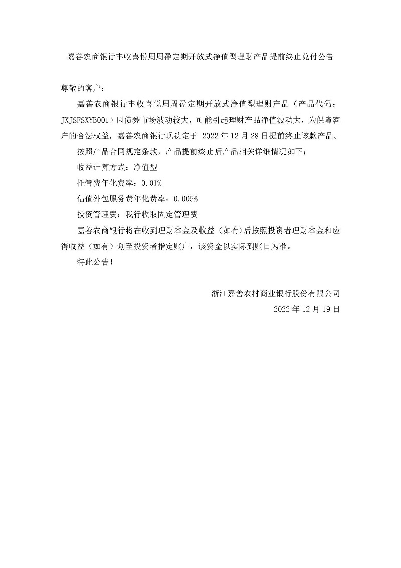 财富管理 自营理财业务 产品公告 产品发售信息 代销理财业务 代销理财业务介绍 代销理财相关公告 代销理财产品信息 代销信托业务 代销信托业务介绍 代销信托相关公告 贵金属 贵金属业务介绍 三方存管 第三方存管业务介绍 第三方存管业务公告 首页 财富管理 自营理财业务 产品公告 到期公告 丰收喜悦周周盈理财产品提前终止公告 发布时间: 2022/12/19 返回列表