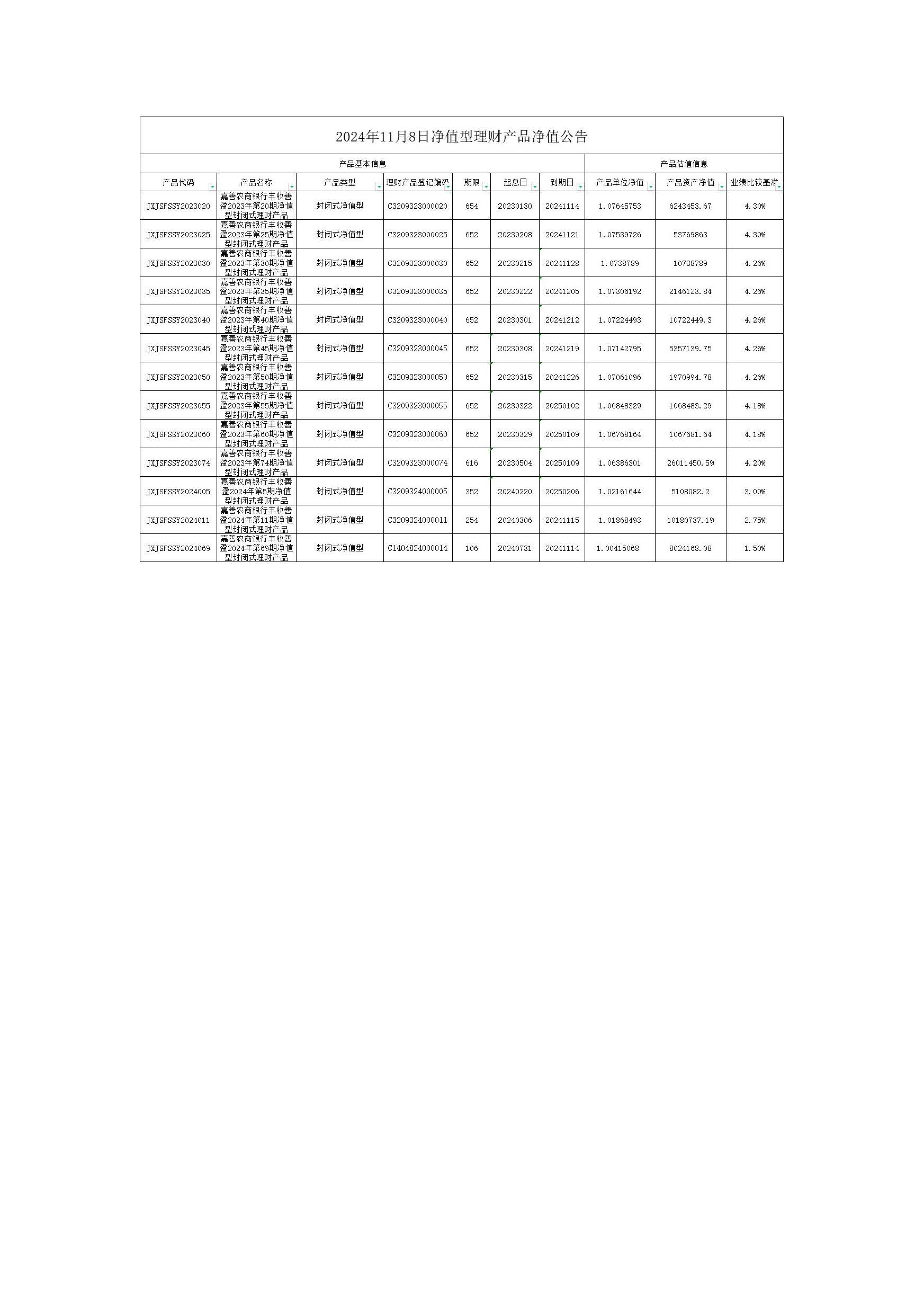 财富管理 自营理财业务 产品公告 产品发售信息 代销理财业务 代销理财业务介绍 代销理财相关公告 代销理财产品信息 代销信托业务 代销信托业务介绍 代销信托相关公告 贵金属 贵金属业务介绍 三方存管 第三方存管业务介绍 第三方存管业务公告 首页 财富管理 自营理财业务 产品公告 净值型理财估值公告 嘉善农商银行丰收善盈系列理财产品每周净值公告 发布时间: 2024/11/11 返回列表